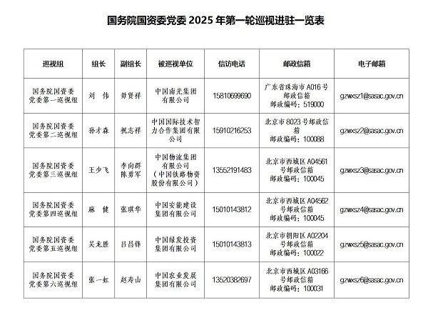 按照國務(wù)院國資委黨委和巡視工作領(lǐng)導(dǎo)小組部署安排,截至2025年5月20日,國務(wù)院國資委黨委2025年第一輪巡視完成進(jìn)駐工作。國務(wù)院國資委黨委6個(gè)巡視組將對中國國際技術(shù)智力合作集團(tuán)有限公司、中國農(nóng)業(yè)發(fā)展集團(tuán)有限公司、中國安能建設(shè)集團(tuán)有限公司、中國南光集團(tuán)有限公司、中國物流集團(tuán)有限公司、中國綠發(fā)投資集團(tuán)有限公司等6家企業(yè)黨委開展常規(guī)巡視,對中國物流集團(tuán)有限公司所屬中國鐵路物資股份有限公司黨委開展提級(jí)巡視。
